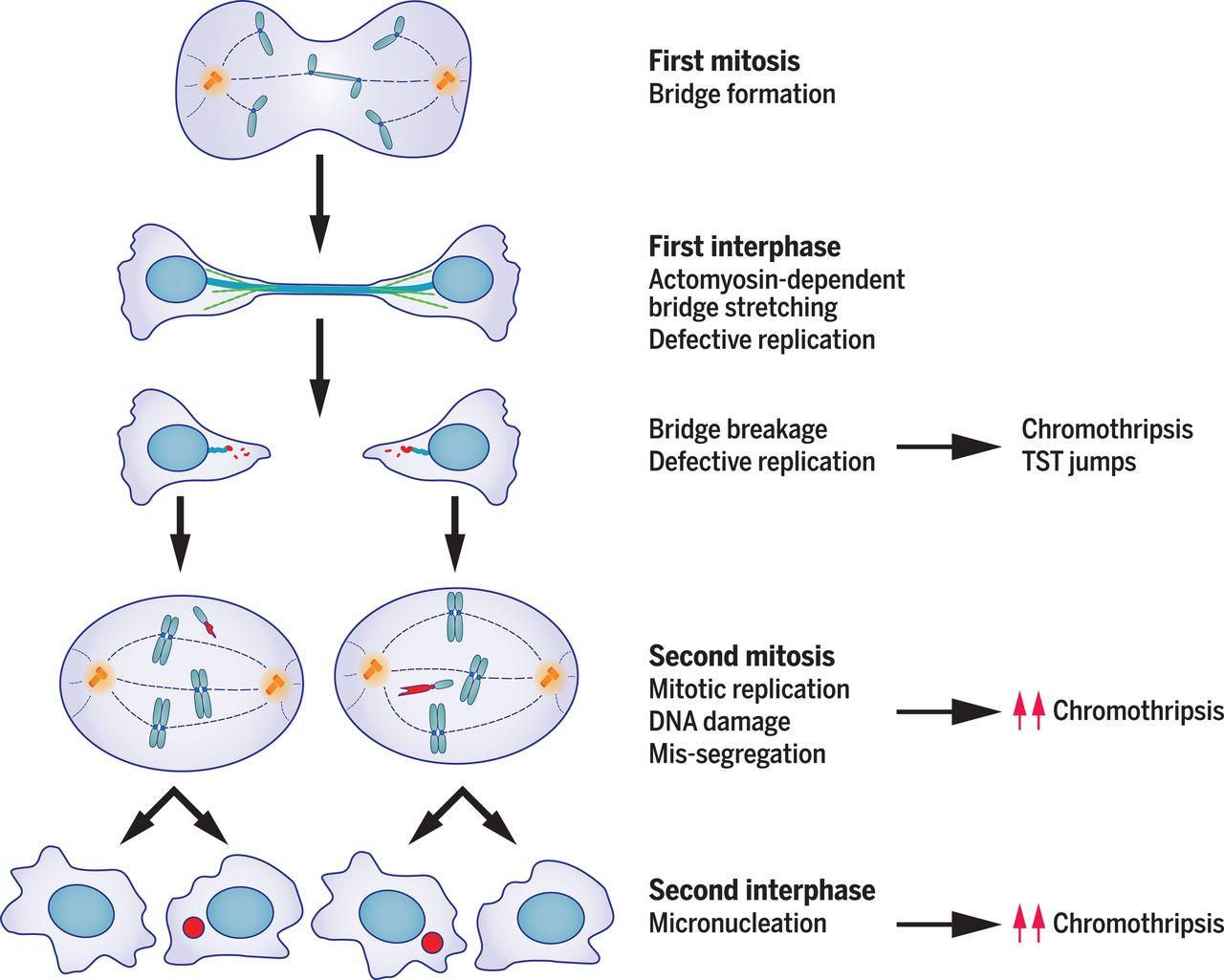 Many human tumors display scrambled genomes that arise from two distinct mutational processes. The first, the chromosome breakage-fusion-bridge (BFB) cycle, produces gene amplification and genomic instability. The second, chromothripsis, generates massive, clustered genomic rearrangements in one or a few chromosomes. Umbreit et al. hypothesized that these two processes are mechanistically related and tested this idea by recreating essential steps of the BFB cycle in cultured cells (see the Perspective by Paiano and Nussenzweig). They found that chromothripsis arises from a cascade of events that begins with aberrant chromosome bridge formation during mitosis, followed by chromosome fragmentation, DNA damage, chromosome missegregation, and the formation of micronuclei. They propose a model that explains how a single cell division error (chromosome bridge formation) can generate many hallmark features of cancer genomes.