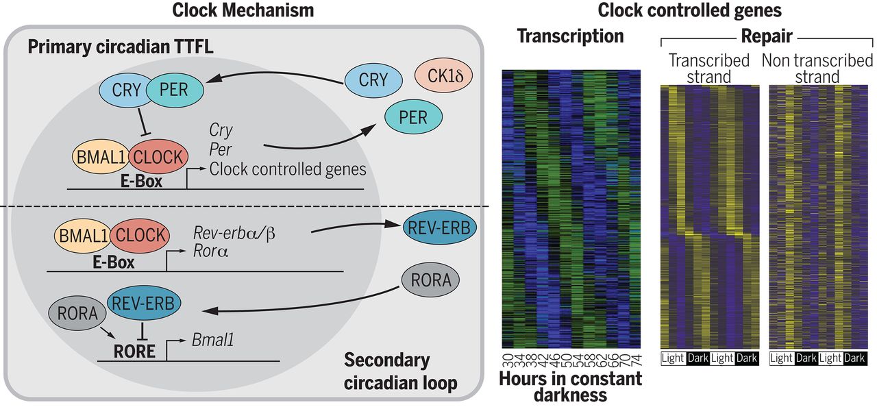 图:哺乳动物生物钟调控转录过程及DNA修复机制。(左侧)哺乳动物生物钟机制是一个具备时间延迟效应的转录-翻译反馈回路(TTFL)。BMAL1-CLOCK构成正调控臂,而隐花色素(CRY1和CRY2)与周期蛋白(PER1和PER2)构成抑制性负调控臂;主反馈环路通过由REV-ERBα抑制剂和RORα激活剂组成的次级环路得以强化。在特定组织中,约10%的基因表现出显著的昼夜节律(近24小时)周期性表达。(右侧)两个热图展示了生物钟对小鼠转录过程及核苷酸切除修复的影响,其中绿色(转录)和黄色(修复)代表信号强度。左侧表达热图显示在持续黑暗44小时的小鼠肝脏中检测到854个受生物钟调控的转录本[改编自B. H. Miller等,《美国国家科学院院刊》104, 3342 (2007),版权所有(2007)美国国家科学院]。这些基因均在特定日间时段达到表达峰值。右侧修复热图则显示在12小时光照-12小时黑暗条件下经化疗药物顺铂处理后的小鼠肾脏中检测到1661个基因[改编自Y. Yang等,《美国国家科学院院刊》115, E4777 (2018),版权所有(2018)美国国家科学院]。研究分别量化了转录链(TS)和非转录链(NTS)的损伤程度。非转录链显示所有基因呈现单相节律,损伤修复峰值出现在傍晚时分。而转录链中,每个基因在周期内对应其转录峰值相位时表现出特异的修复高峰。这种个体化基因修复时序的复杂性,为优化化疗药物给药的昼夜节律时机选择带来了重大挑战。