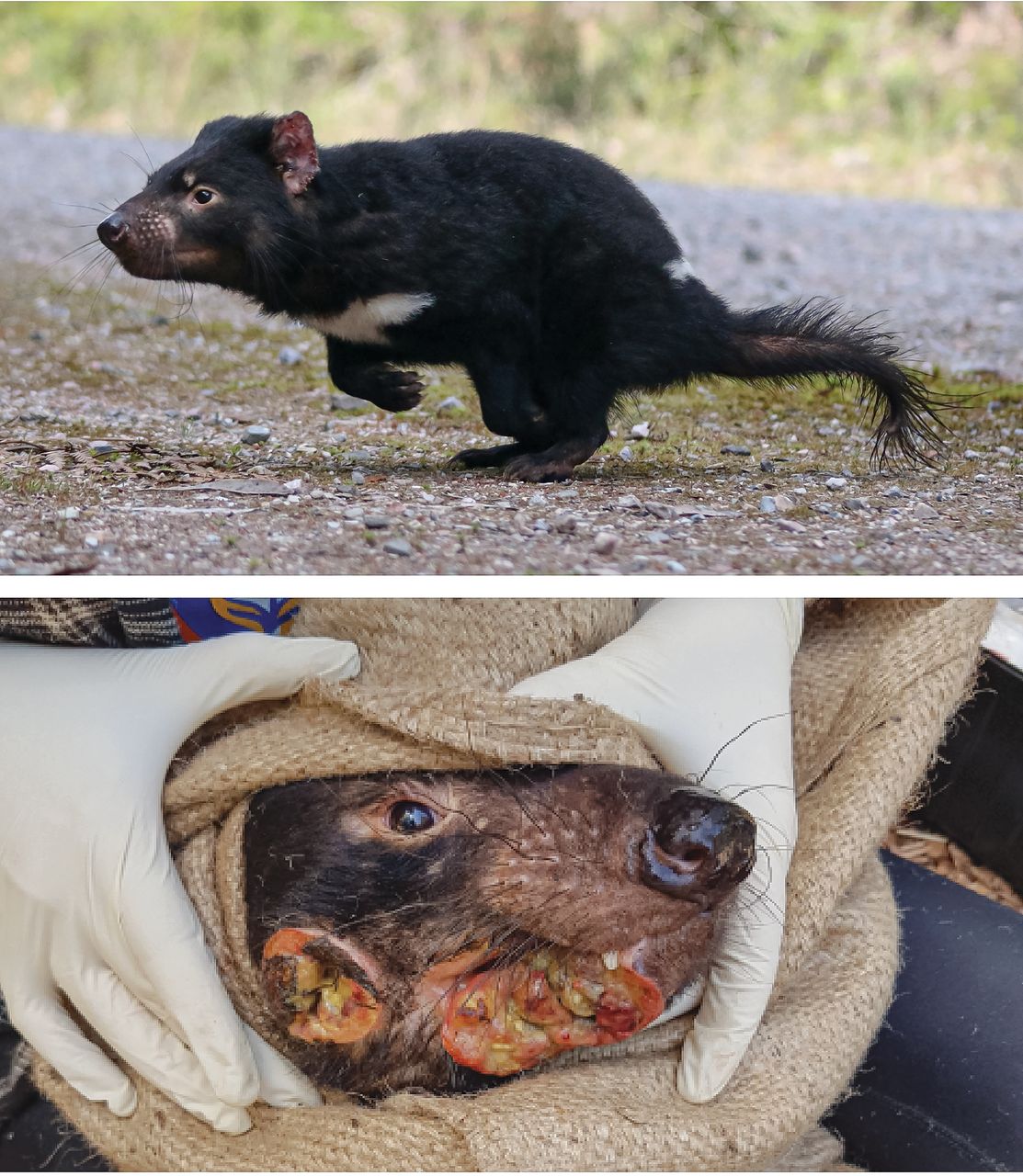 图:袋獾及其传播性癌症。健康的(上图)和感染DFTD的(下图)塔斯马尼亚恶魔。