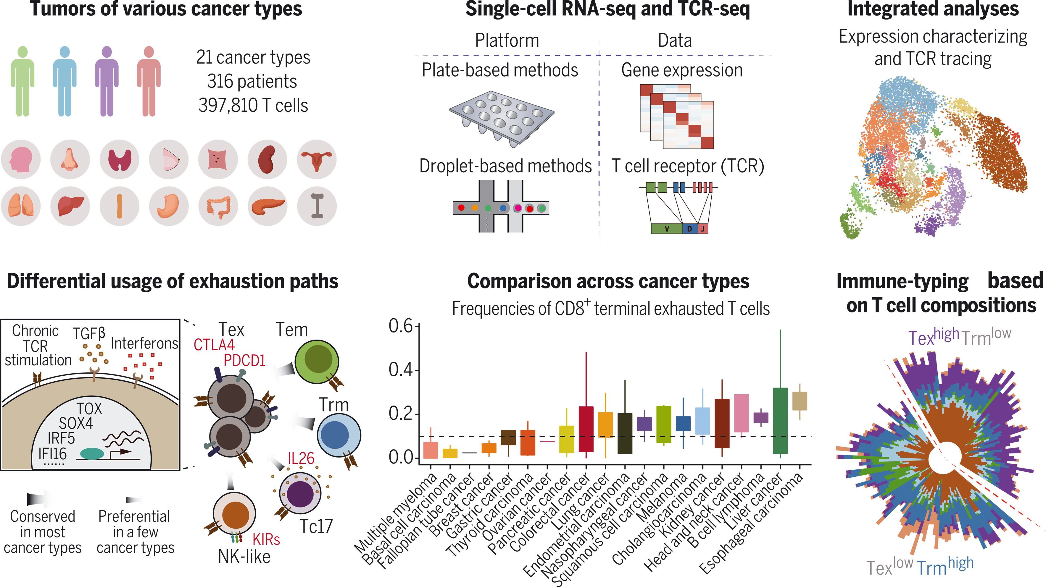 The tumor microenvironment contains many different kinds of immune cells, the composition, function, and roles of which are unclear. Using single-cell RNA sequencing of T cells in 21 cancer types from more than 300 patients, Zheng et al. identified differences in transcript composition that could be used to catalog different T cell types (see the Perspective by van der Leun and Schumacher). These annotations identified the different roles of specific types of CD4+ and CD8+ T cells among the different tumor types. Some of these clusters revealed evidence for two developmental paths for T cells, one of which shows a trajectory toward the “exhausted” T cell state, knowledge of which may be useful in developing future cancer immunotherapies. —LMZ