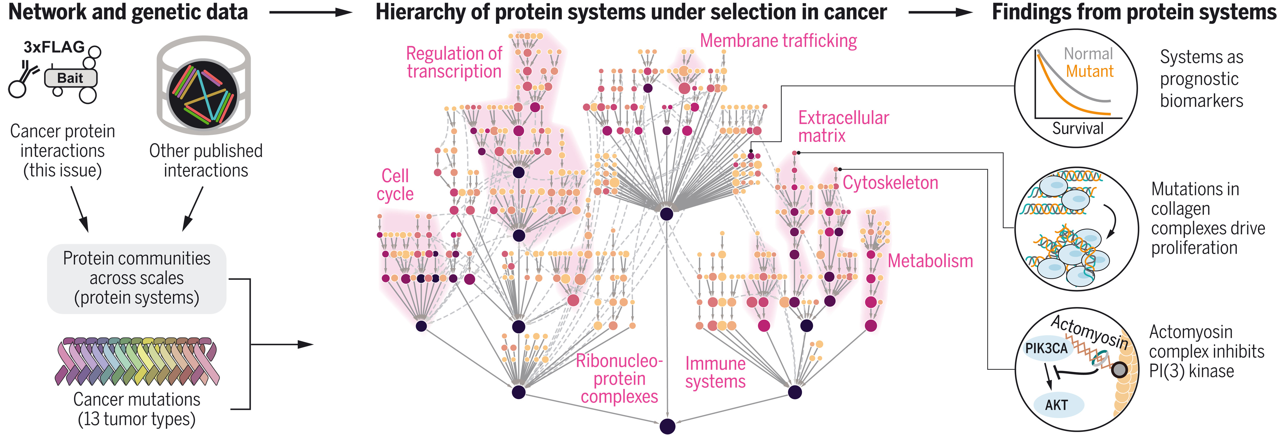 图:癌症蛋白质系统图谱绘制。通过整合蛋白质相互作用数据集,在多个分析尺度上识别蛋白质群落(“系统”)(左图)。针对每个系统进行癌症突变选择测试,以系统整体与其组分蛋白质进行对比,揭示了癌症中选择性作用下蛋白质系统的层级结构(中图)。该层级结构中的发现(右图)已通过临床数据和功能实验得到验证。