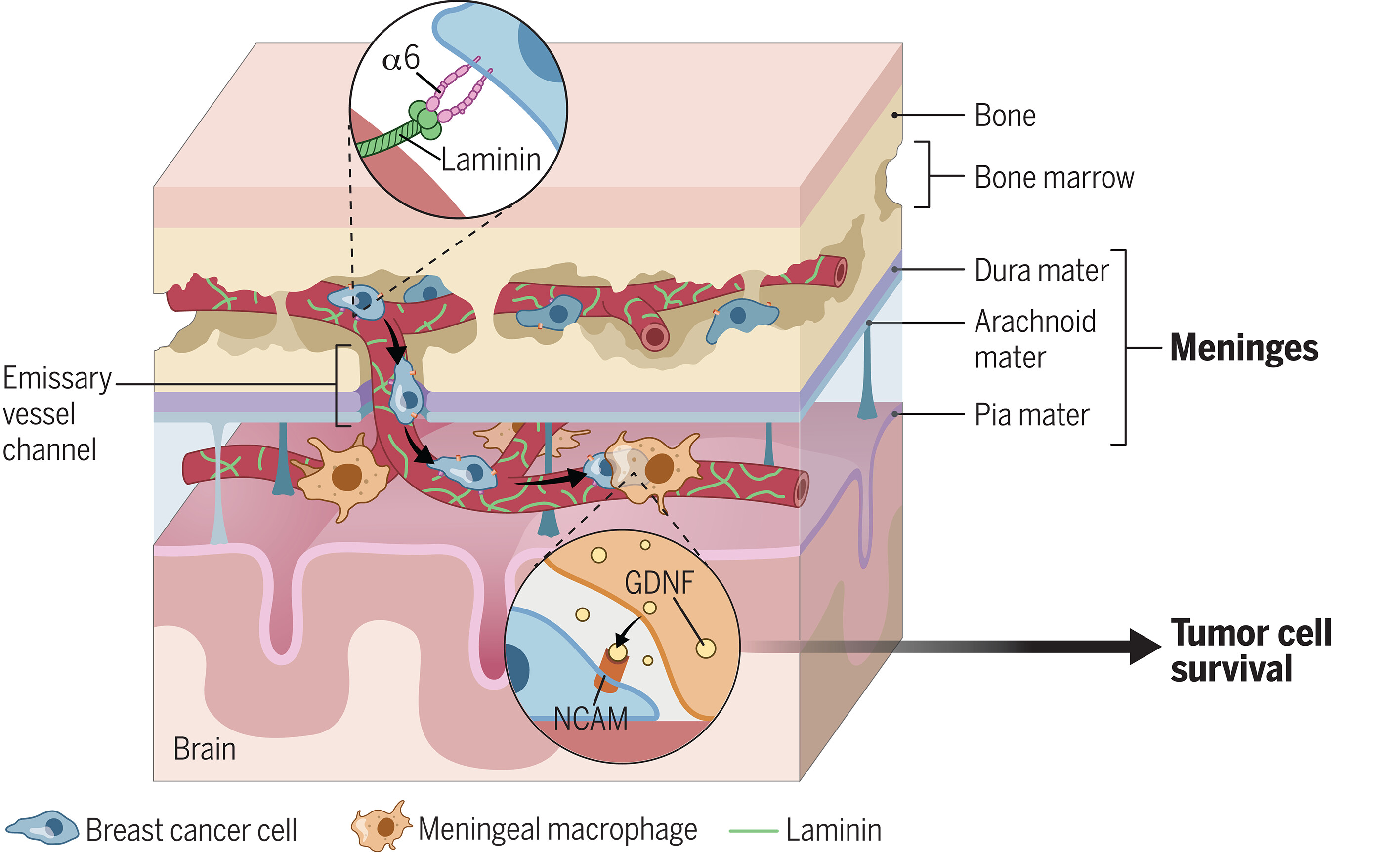 Treatment outcomes for breast cancer metastasis to the leptomeninges (LM), the cerebrospinal fluid–containing membranes that line the surface of the brain and spinal cord, are extremely poor. Whiteley et al. used experimental models of breast cancer LM metastasis to show that breast cancers expressing the cell surface receptor integrin α6 can invade the LM by traversing the outer surface of the blood vessels that normally connect the adjacent vertebral and skull bone marrow to the central nervous system meninges (see the Perspective by Monteran and Erez). Breast cancer cells then stimulate resident meningeal macrophages to secrete a neuronal prosurvival protein called glial-derived neurotrophic factor that supports tumor growth. These findings shed new light on tumor-host interactions in the LM and may guide new therapeutic targets for the treatment of LM metastasis. —Priscilla N. Kelly